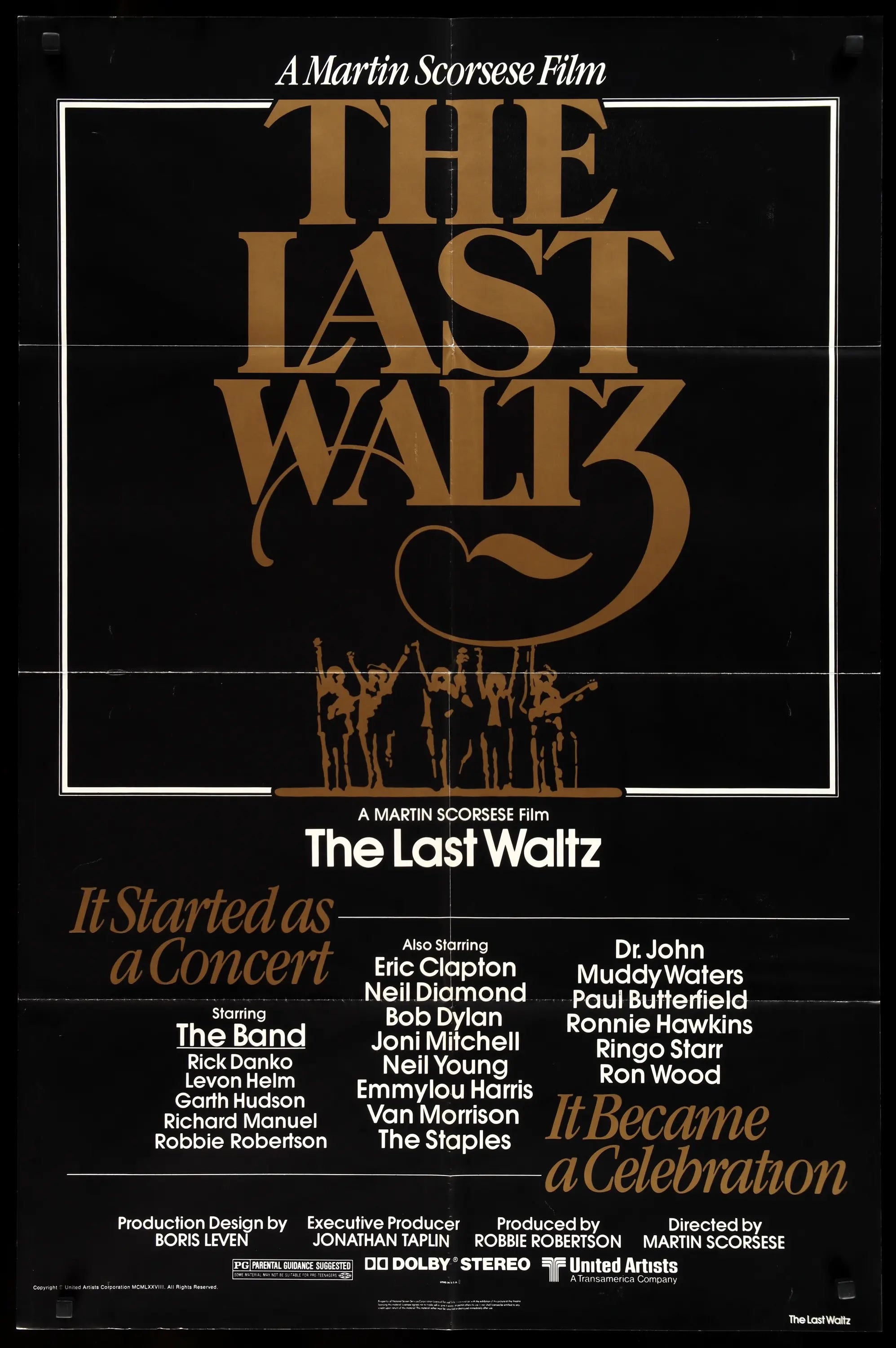 This is an original, one-sheet movie poster from 1978 for The Last Waltz. Martin Scorsese directed the film featuring The Band (comprised of Rick Danko, Levon Helm, Garth Hudson, Richard Manuel and Robbie Robertson) during their “farewell” performance at San Francisco’s Winterland Ballroom in 1976. The film features appearances and performances by Eric Clapton, Neil Young, Neil Diamond, Bob Dylan, Joni Mitchell, Emmylou Harris, Van Morrison, Dr. John, Muddy Waters, Paul Butterfield, Ringo Starr and Ron Wood.
